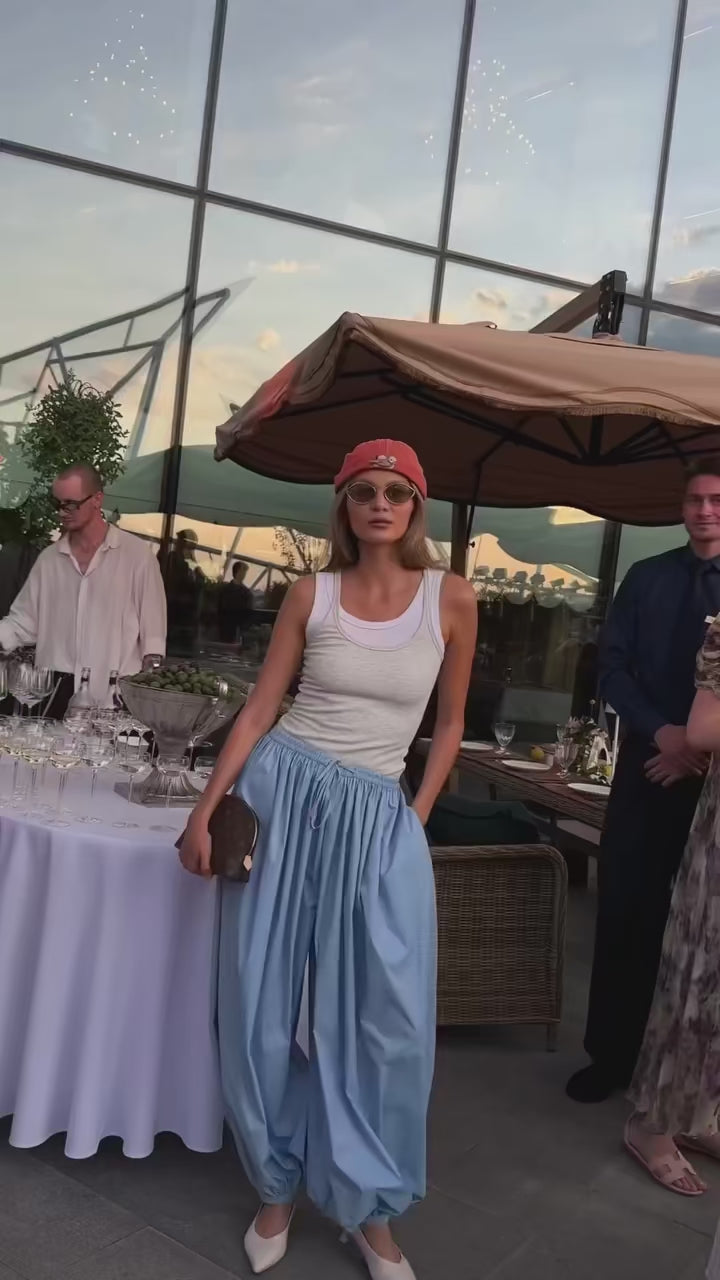 sky blue::Person wearing a white sleeveless top and light blue wide-leg pants standing against a tiled wall.