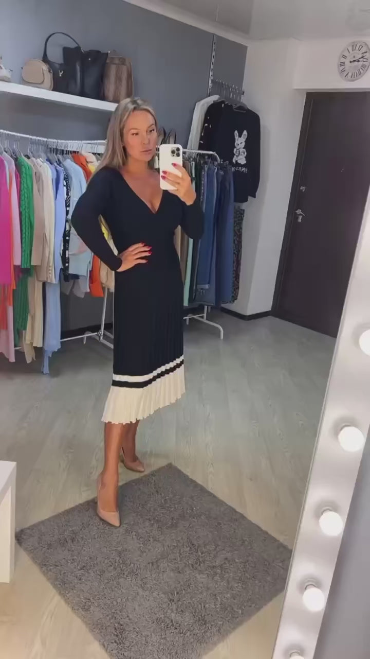 allvariants:: Black pleated dress worn by a person on a white background