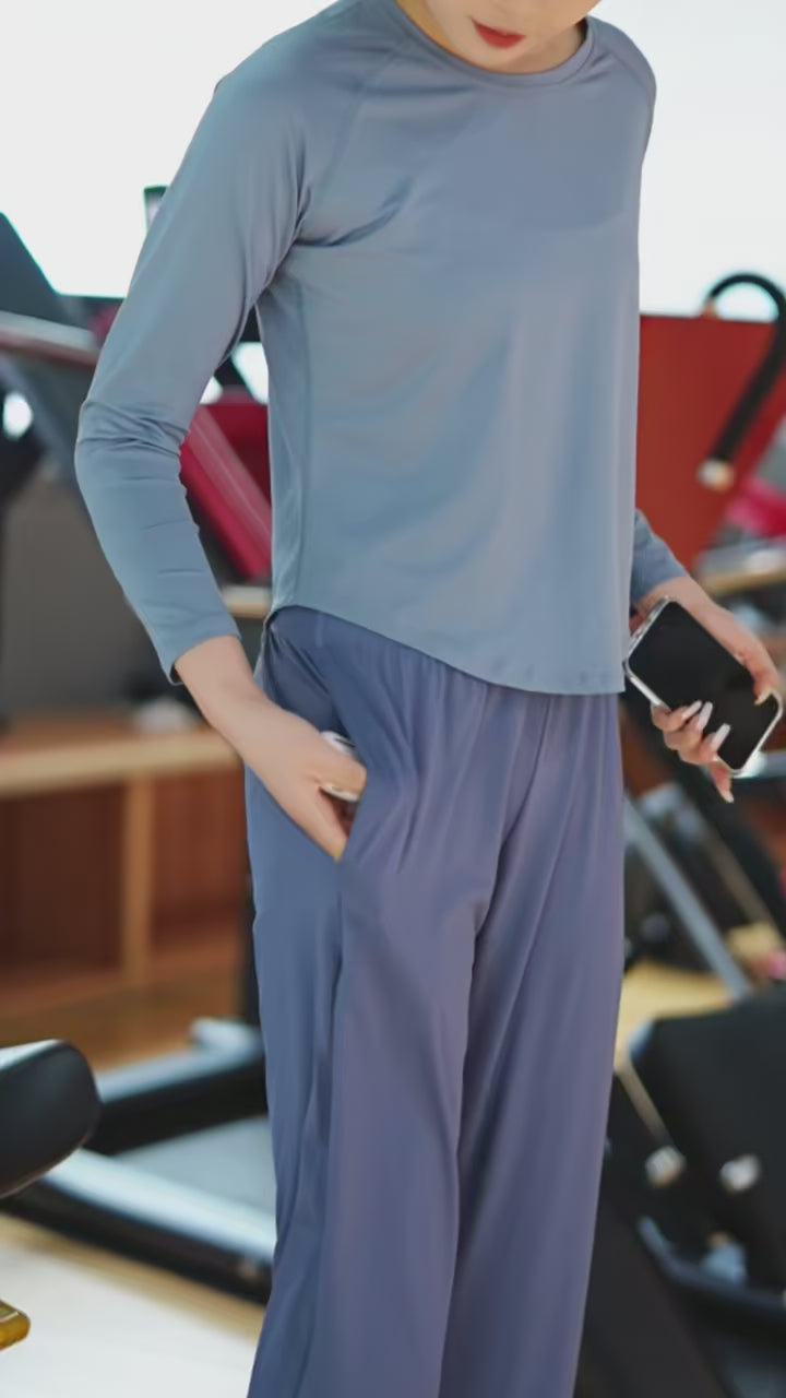 This two-piece yoga set is designed for comfort, movement, and everyday training. The set includes a long sleeve fitness top and matching high waist sports pants, offering a balanced fit that feels supportive without restricting movement. Made for workouts, stretching, or relaxed active days, it combines practicality with a clean, modern look.