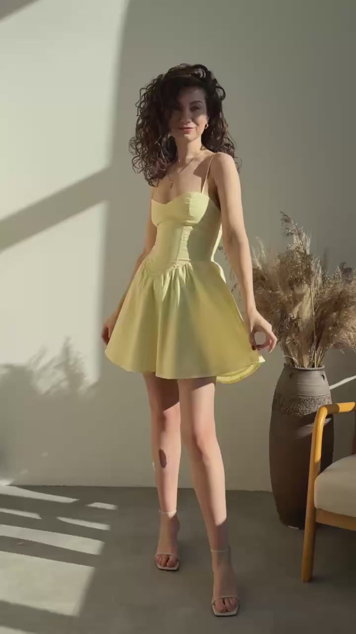 <p>This yellow fit-and-flare mini dress brings a bright, feminine feel to summer occasions. The fishbone waist shaping offers gentle structure through the midsection, creating a flattering silhouette without feeling restrictive. A lace-up back completes the look with a soft, elegant touch, while the sling neckline keeps it light and comfortable for warm days.</p>